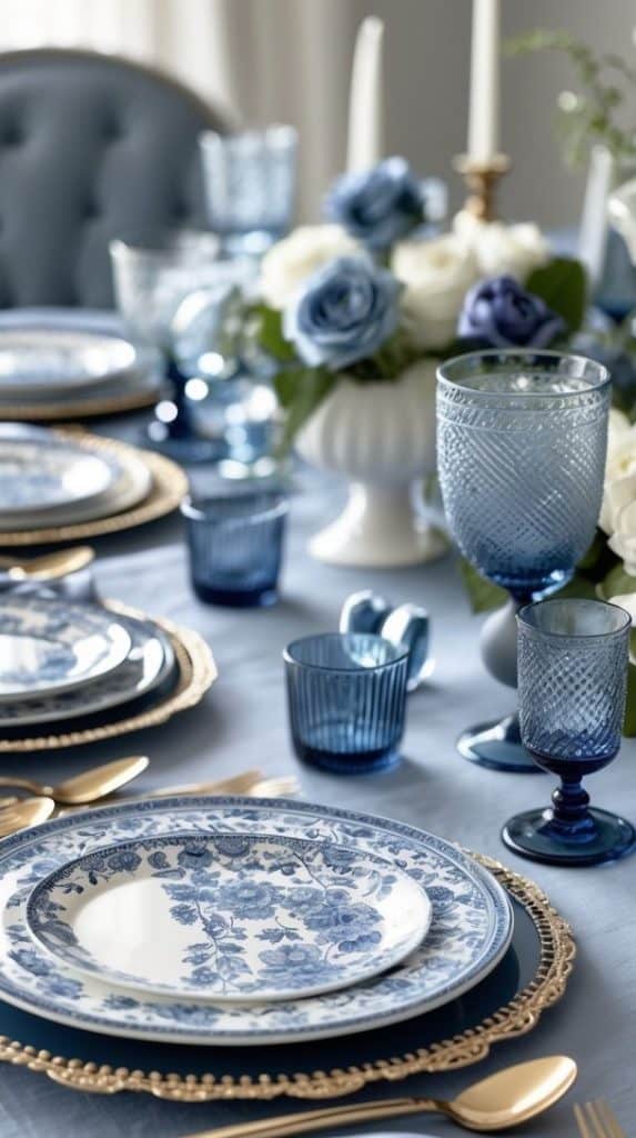 The contrast is striking yet serene. Blue goblets and layered china echo the palette, creating a cohesive setting that feels both intimate and elevated.