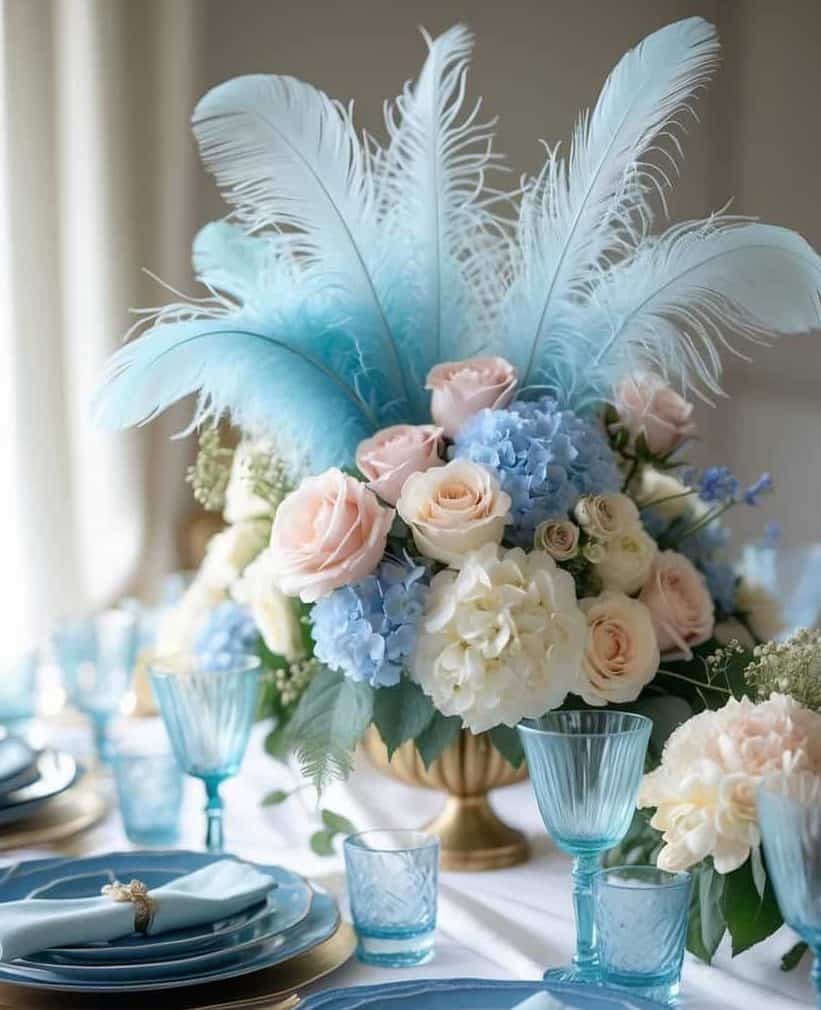 Oversized powder-blue feathers rising from a lush arrangement of hydrangeas and blush roses make an unforgettable statement centerpiece.