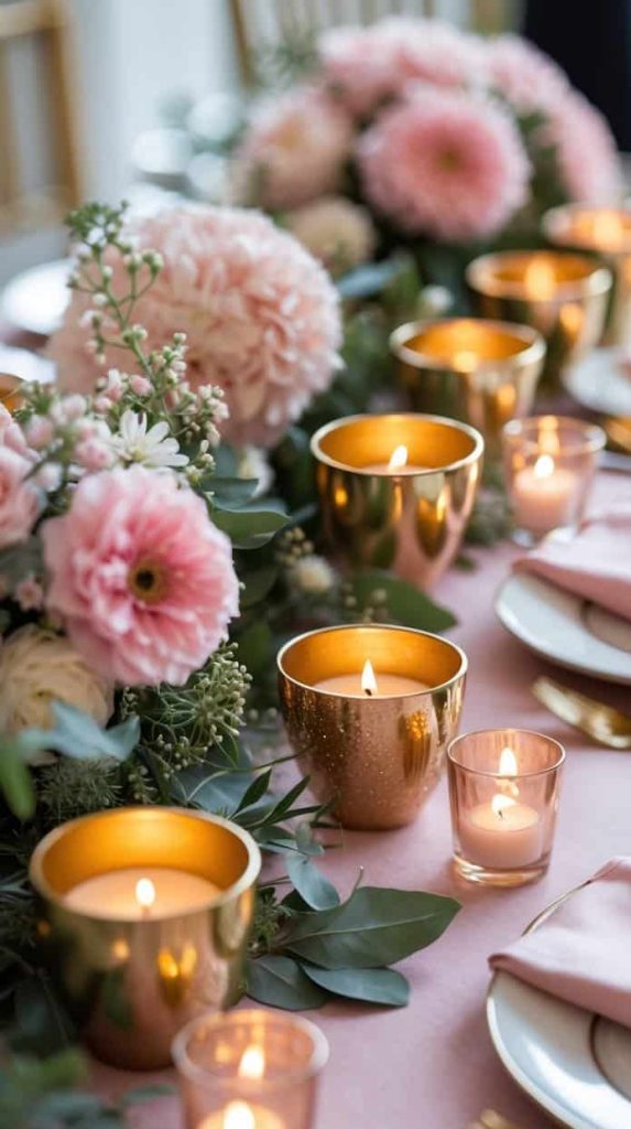 Clusters of pink dahlias and roses intertwine with muted greenery, while gleaming gold votives bring a touch of glam to the table.