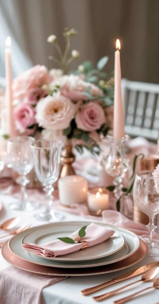 The pink linens and blush-toned chargers keep the look effortlessly cozy, while metallic rose gold accents add a touch of sparkle. This arrangement feels like a quiet love letter brought to life.
